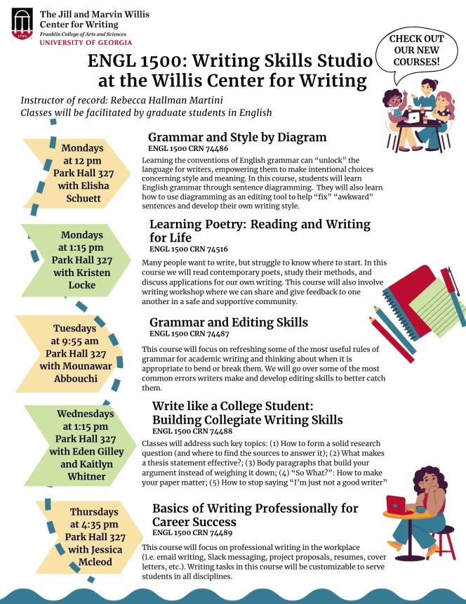 The Jill and Marvin Willis Center for Writing offers support to students, faculty, and staff on a wide variety of writing projects. Our services are free of cost and available to all UGA writers. We are strongly committed to providing our community with support.