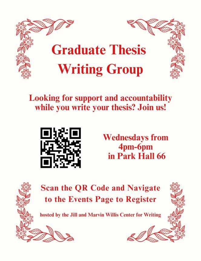 Are you a graduate student looking for support writing your thesis? Join us Thursdays from 4pm-6pm in Park Hall 66!