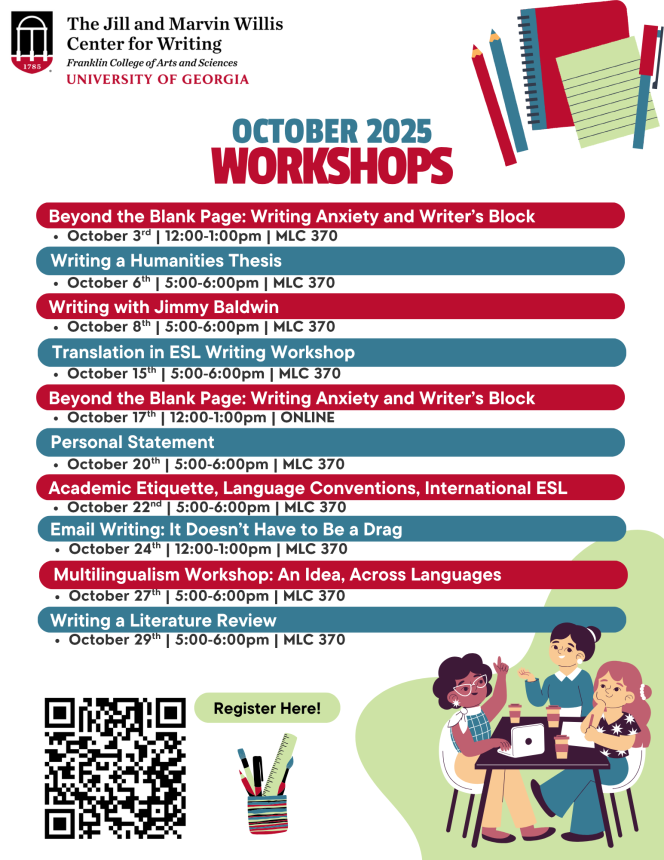 To register, please navigate to the events page on UGA’s Writing Center Platform Penji: UGA WCW Penji Community.We hope to see you there!